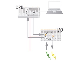 Response times in a conventional solution are influenced by a number of factors such as network performance, or the number of nodes on the network, as well as network traffic and controller performance. With conventional signal processing, the input driver in an I/O module reads the input signal and converts it into a logic signal. This signal is then sent over the network to the central PLC. The PLC processes the signal and sends it back to the module. The output driver once again converts it and sends it to where it is needed. With this approach, there is no way to achieve response times much below the millisecond range.